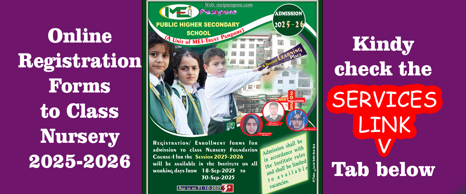 MEI Muslim Educational Institute established upto 8th Standard long before four decades by some eminent persons with routine and no definite objectives and looked for renaissance till the end of 1992. The rebirth of the dispersed Institute and its upgradation at the laborious hand of the first elected management, with reshape Institute as a place of teaching and service to community. These components flow from 'The Ahsabi-sofah (RA)' Institute the vision which helps us in and though visible world to know and experience the invisible God.
